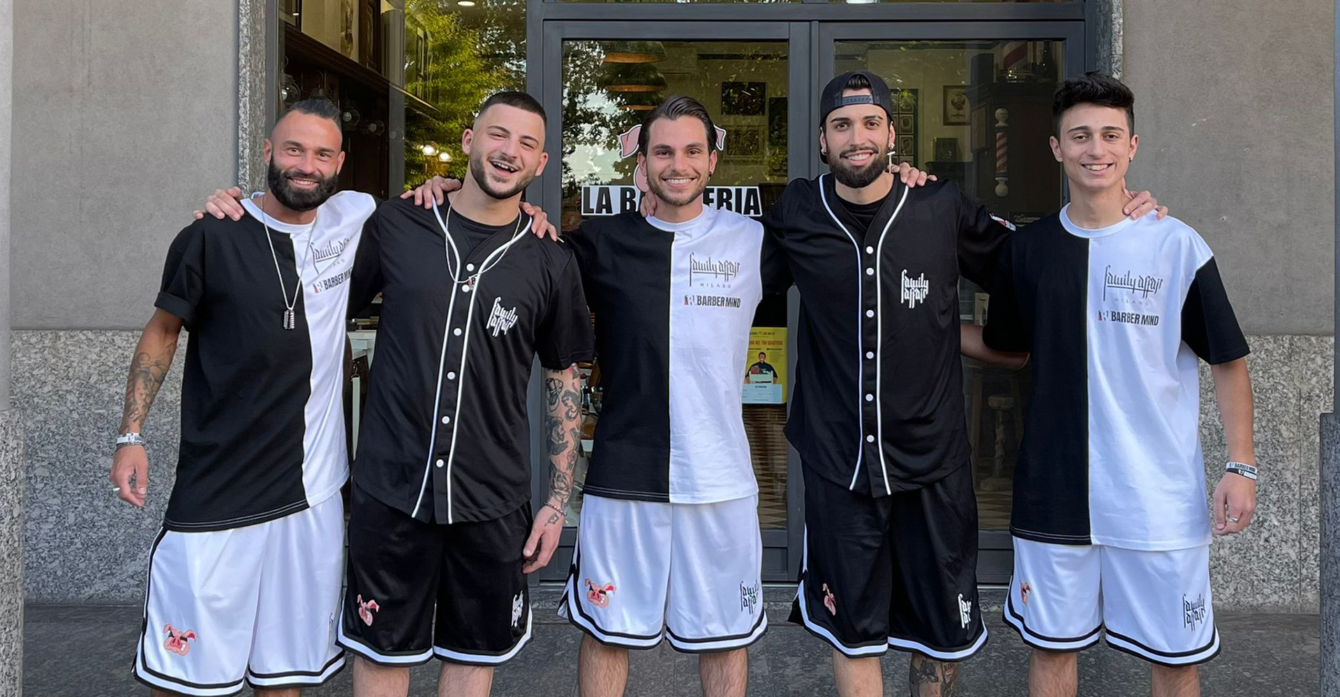 Abbiamo pensato a due divise differenti: la prima è un completo total black, con giacca da baseball e pantaloncini da basket; la seconda invece è bicolor, con maglia in cotone bianca e nera e pantaloncini bianchi! Entrambe espongono il logo de La Barbieria di Milano, di Barber Mind e quello di Family Affair!